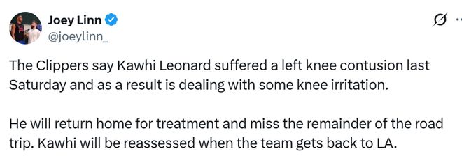 北京時間1月19日,快船官方表示,科懷-萊昂納德于當?shù)貢r間上周六遭遇左膝挫傷,進而引發(fā)了膝蓋的炎癥反應。他將返回洛杉磯接受治療,并缺席球隊客場之旅的剩余賽程。待球隊回到洛杉磯后,萊昂納德的傷情將重新接受評估。
