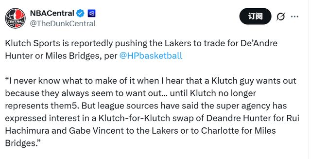 Hardwood Paroxysm寫道:“每次聽到Klutch旗下的球員想要離隊(duì),我都不知道該作何感想——他們似乎總?cè)氯轮摺芍钡終lutch不再代理他們的合約,這種聲音就消失了。不過據(jù)聯(lián)盟消息源透露,這家頂級(jí)經(jīng)紀(jì)公司已表達(dá)了交易意向,希望促成一筆‘Klutch內(nèi)部球員互換’:要么將德安德烈-亨特送至湖人,換取八村塁和加布-文森特;要么用同樣的籌碼,向夏洛特黃蜂隊(duì)交易邁爾斯-布里奇斯?!?/p>