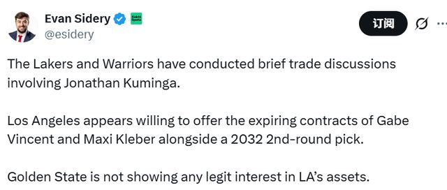 據(jù)披露,湖人給出的報(bào)價(jià)包含文森特與克勒貝爾即將到期的合同,外加一個(gè)2032年的次輪選秀權(quán)。Sidery表示,勇士隊(duì)對(duì)這些籌碼并未表現(xiàn)出任何真切興趣,背后原因其實(shí)不難理解。