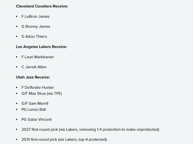 爵士得到:亨特、斯特魯斯、梅里爾、朗佐-鮑爾、文森特、湖人2027年首輪簽(移除前四順位保護(hù),變?yōu)闊o保護(hù)簽)、湖人2031年首輪簽(前四順位保護(hù))