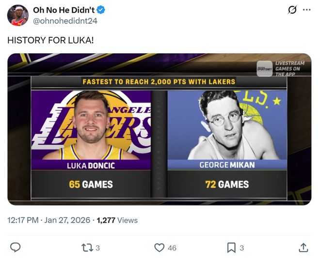 紀(jì)錄一:東契奇僅花費(fèi)65場(chǎng)比賽就拿到湖人生涯2000分,超越1972年的喬治麥肯創(chuàng)湖人隊(duì)史最快;