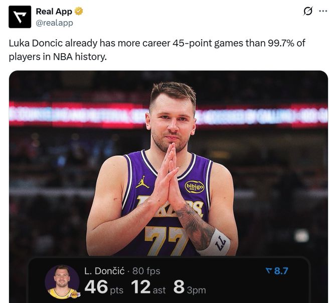 紀(jì)錄四:本場(chǎng)是東契奇生涯第20次單場(chǎng)交出45+得分表現(xiàn),成功追平利拉德、威少和賈巴爾并列歷史第15名,已經(jīng)超過(guò)NBA歷史上99.7%的球員;