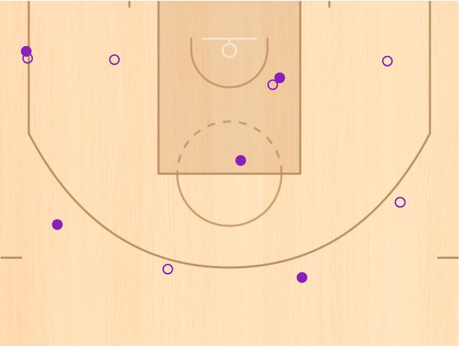從戰(zhàn)術(shù)地位上看,陳林堅(jiān)本場(chǎng)比賽獲得了11次出手機(jī)會(huì),遠(yuǎn)遠(yuǎn)高于聯(lián)賽中場(chǎng)均7.2次出手。這在一定程度上說明,當(dāng)山東隊(duì)能夠把更多機(jī)會(huì)輸送到陳林堅(jiān)手中時(shí),他是一定可以給球隊(duì)帶來更大幫助的。與此同時(shí),從投籃分布上看,陳林堅(jiān)本場(chǎng)比賽并沒有過多地埋伏在底角,而是更多地提到上線接球。這才是一個(gè)核心射手的打法,也是他在福建隊(duì)時(shí)更熟悉的打法。陳林堅(jiān)有5次在高位的投籃,投進(jìn)3球,命中率高達(dá)60%。