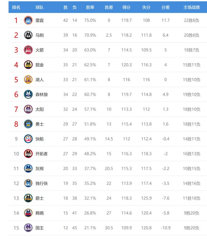 今日比賽后火箭、掘金排名互換,其他西部球隊(duì)排名不變。