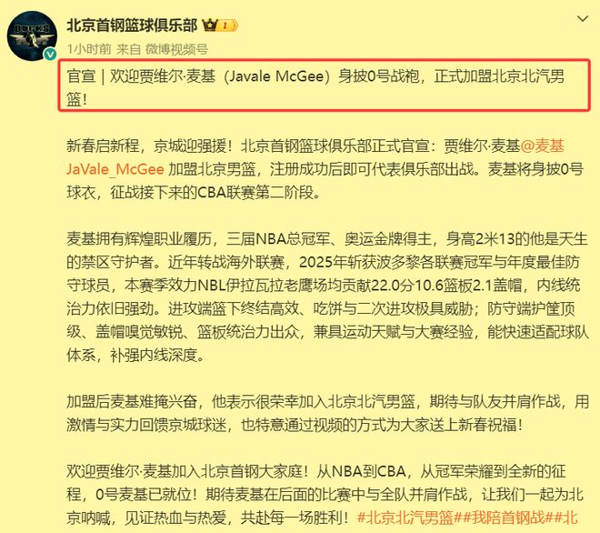2月17日大年初一這一天,對于絕大多數(shù)國人來說都在休年假,沉浸在歡樂的新年氣氛當(dāng)中。但是,北京首鋼隊的小編卻早早開工了,正式官宣北京首鋼隊已經(jīng)和冠軍中鋒麥基簽約。