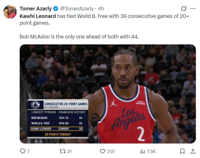 這場(chǎng)比賽后小卡已經(jīng)連續(xù)36場(chǎng)比賽拿到20+排在快船隊(duì)史第二,他僅次于麥卡杜的連續(xù)44場(chǎng)20+,戰(zhàn)神卡也再度刷新自己連續(xù)上雙的場(chǎng)次。