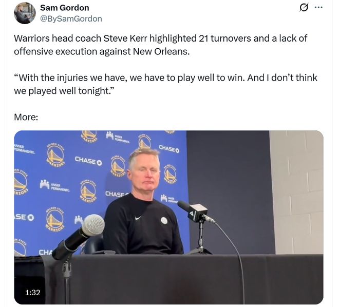 科爾還專門指出失誤與執(zhí)行力問題,強(qiáng)調(diào)球隊全場出現(xiàn)21次失誤太多,也正如科爾所說,由于傷病問題過于嚴(yán)重,現(xiàn)有勇士球員硬實(shí)力有限,想要贏球必須持續(xù)打出高水準(zhǔn),稍有偏差就會輸球,而本場勇士部分球員又表現(xiàn)不夠出色。
