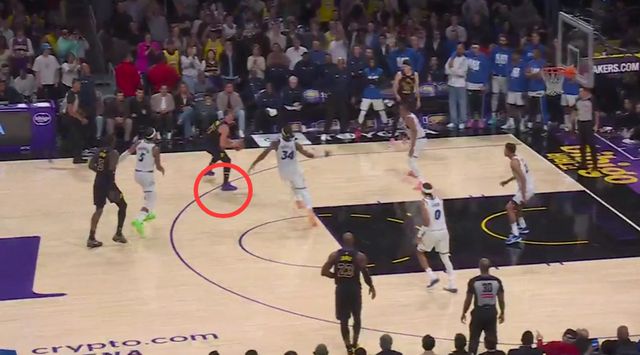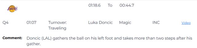第一次漏判發(fā)生在距離比賽結(jié)束還有1分7秒,東契奇在左腳觸地時完成合球,合球后多走了兩步以上,構(gòu)成走步違例。裁判沒有響哨,這是一次漏吹的走步違例,湖人獲利,魔術(shù)吃虧。
