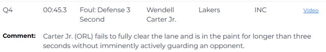 第二次漏判發(fā)生在距離比賽結(jié)束還有45.3秒,魔術(shù)的小卡特在沒有積極防守對位球員的情況下,在己方禁區(qū)停留時間超過3秒,這是一次漏吹的防守三秒違例,湖人吃虧,魔術(shù)獲利。