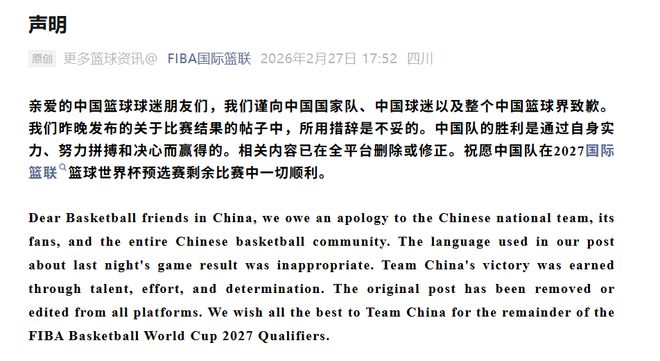 這兩條報(bào)道內(nèi)容中毫無(wú)對(duì)相關(guān)方面的貶損之義,甚至大加贊賞。當(dāng)然,國(guó)際籃聯(lián)沒(méi)必要和中國(guó)網(wǎng)友打一場(chǎng)關(guān)于英語(yǔ)表達(dá)的嘴巴官司,改了道歉了,對(duì)他們來(lái)說(shuō)這事就結(jié)束了。