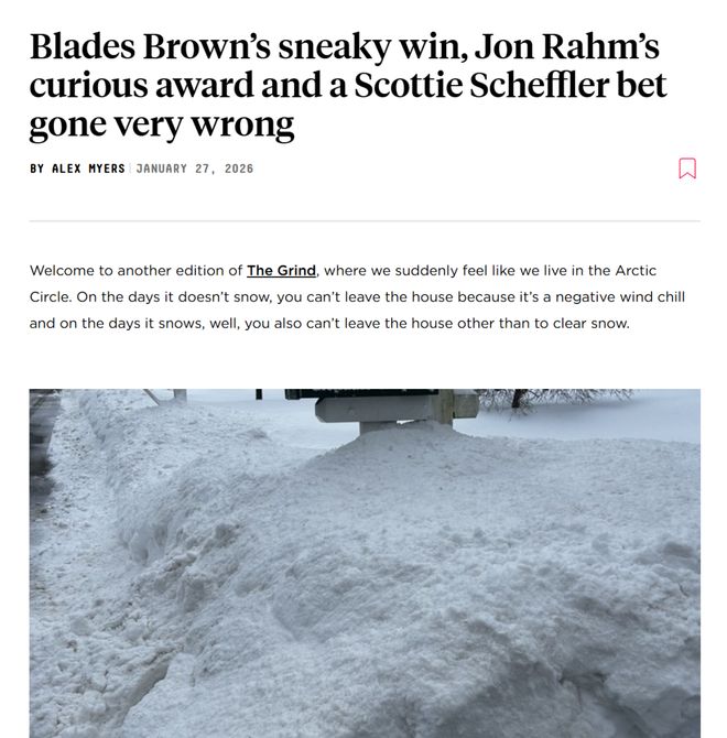再比如《高爾夫文摘》1月27日對(duì)巴哈馬國(guó)際巡回賽的戰(zhàn)況介紹標(biāo)題為“Blades Brown’s sneaky win, Jon Rahm’s curious award and a Scottie Scheffler bet gone very wrong”(布萊茲?布朗的意外制勝、喬恩?拉姆的離奇獎(jiǎng)項(xiàng),還有斯科蒂?謝夫勒那場(chǎng)徹底搞砸的賭約)。