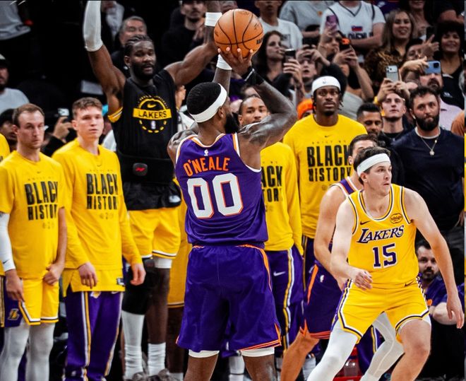 在本場(chǎng)比賽的最后時(shí)刻,詹姆斯補(bǔ)籃一度將比分扳平,在比賽最后還剩下22.8秒的時(shí)候,雙方戰(zhàn)成110平,太陽(yáng)利用快速轉(zhuǎn)換,找到大空位的奧尼爾,隨后奧尼爾不負(fù)眾望,三分投進(jìn),只留給湖人0.9秒的時(shí)間,準(zhǔn)絕殺對(duì)手。在上一場(chǎng)面對(duì)魔術(shù)的比賽中,湖人被小溫德爾-卡特補(bǔ)籃準(zhǔn)絕殺。