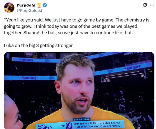 東契奇賽后也開心的表示:“我認為今天是我們(湖人三巨頭)一起打得最好的比賽之一,我們在分享球方面做得很好,相信我們會越打越好?!?/p>