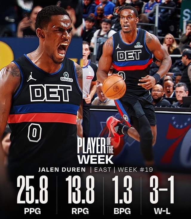 過去一周,杜倫場均25.8分13.8籃板,投籃命中率63.9%,幫助活塞打出3勝1負的戰(zhàn)績。