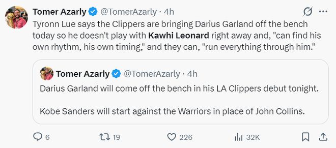 這場(chǎng)比賽之前泰倫盧表示,快船的新援加蘭會(huì)從替補(bǔ)席出發(fā),他不會(huì)一出場(chǎng)就與倫納德搭檔,泰倫盧希望加蘭能夠在第二陣容掌控節(jié)奏與時(shí)機(jī),希望加蘭通過組織進(jìn)攻來幫助球隊(duì)。