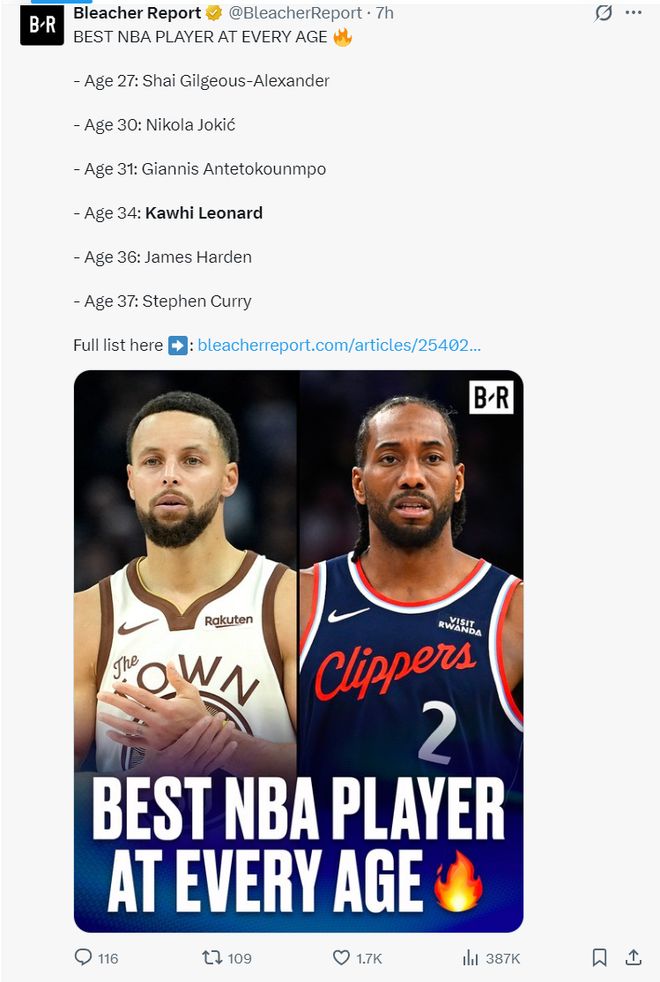 美媒BR也力挺現(xiàn)役最強(qiáng)34歲的球星是倫納德,現(xiàn)役最強(qiáng)37歲的球星是庫里而非杜蘭特。