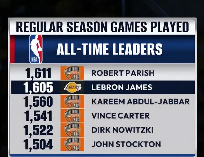 詹姆斯已經(jīng)完成1605場比賽,距離帕里什1611場只差6場,詹姆斯超越帕里什只需要7場比賽,詹姆斯又要升歷史第一了。