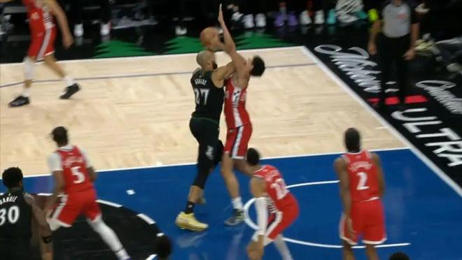 當(dāng)時(shí)比賽里的兩個(gè)回合,尼德豪澤面對(duì)戈貝爾居然完成了晃人+上籃,然后下一個(gè)球,氣不過(guò)的戈貝爾要單挑尼德豪澤,結(jié)果給了尼德豪澤一肘。