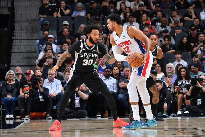 馬刺上一場客場131-91大勝76人,活塞上一場客場109-113惜敗騎士,本賽季首次交鋒馬刺客場114-103戰(zhàn)勝活塞。本場馬刺缺少巴恩斯、加西亞、普拉姆利,活塞缺少瓊斯。首節(jié)開局馬刺攻防壓制10-2領(lǐng)先,活塞追到差4分,雙方拉鋸戰(zhàn)纏斗。馬刺在24-19后,雙核率隊(duì)打出14-2攻勢擴(kuò)大17分優(yōu)勢,斯圖爾特兩罰全中,首節(jié)結(jié)束馬刺38-23領(lǐng)先活塞。首節(jié)馬刺25中14,其中三分13中7,文班亞馬6中4得到12+3+2帽與??怂?中6命中3記三分得到16分;活塞被限制僅有29中7,其中三分8中1,坎寧安7中1僅得到2分2助攻與杜倫5中2僅得到4+4+2犯規(guī)。