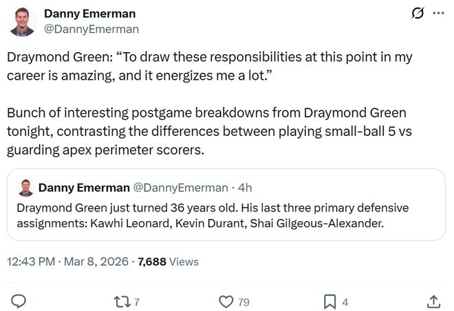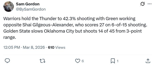 賽后勇士記者Sam Gordon點(diǎn)名稱贊到:“勇士本場將雷霆的投籃命中率限制在42.3%,追夢大部分時(shí)間都在對位亞歷山大,讓后者15投僅6中,成功限制住了雷霆的進(jìn)攻,只可惜自己三分球45投僅14中?!?/p>