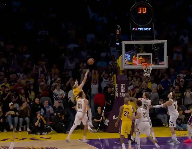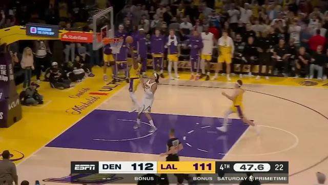 第四節(jié)比賽,掘金的三分手感徹底打開,單節(jié)15中7的三分,其中在兩側(cè)底角就進了6個。好在湖人這邊也能續(xù)上火力,沒有徹底崩盤,里夫斯末節(jié)14分讓湖人等到了東契奇的復(fù)蘇。東契奇之后的三分+三次罰球,讓比賽重新回到同一起跑線。