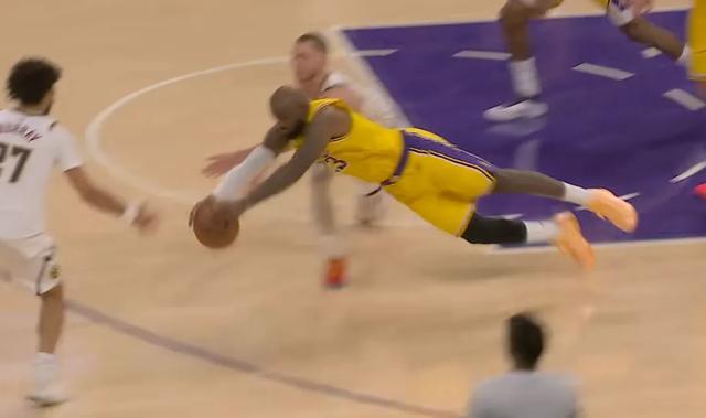 進入最后一分鐘,這場球最讓人動容的鏡頭出現(xiàn)。掘金投籃不中,一次長籃板,在底線的詹姆斯精準(zhǔn)預(yù)判到球的落點,但他腳步速度已經(jīng)不足以讓他搶到第一落點,于是詹姆斯沒有任何猶豫,飛身魚躍把自己扔了出去,在布勞恩身前搶到了籃球。