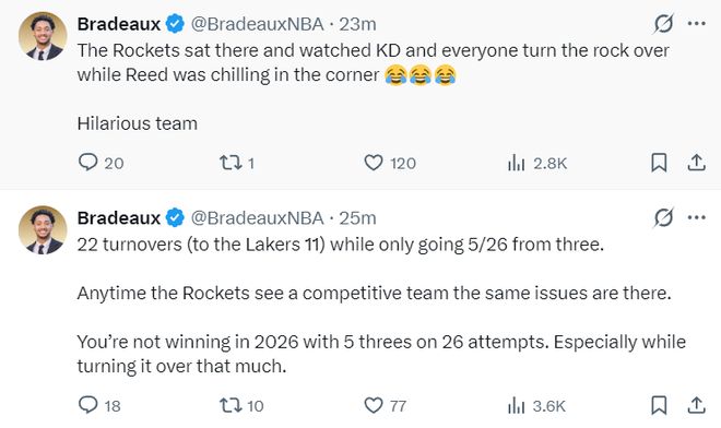 火記:火箭球員們就站在那里看著杜蘭特一頓運(yùn)球,謝潑德則蹲在底角,這真是喜劇的一幕。火箭出現(xiàn)22次失誤湖人才11次,火箭隊(duì)三分26中5,每當(dāng)火箭遇上富有競爭力的對手就會出現(xiàn)相同的問題。在2026年這樣的表現(xiàn)是無法贏球的。