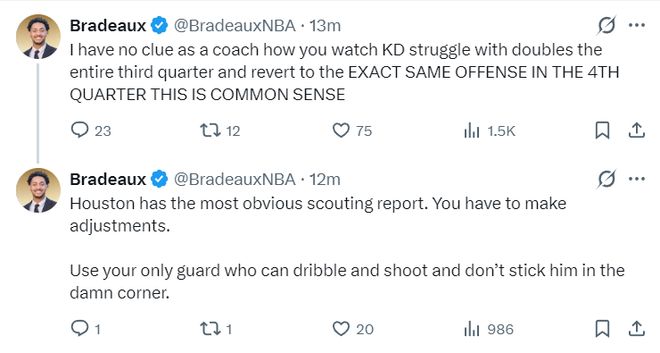 火記:休斯頓現(xiàn)在的情況一目了然,烏度卡就該做出調(diào)整,明明有一個(gè)可以控球的后衛(wèi),你卻把他放在該死的底角。作為教練我實(shí)在是搞不懂,你讓杜蘭特整個(gè)下半場被高位包夾卻沒有任何的戰(zhàn)術(shù)調(diào)整,這簡直就是常識問題。