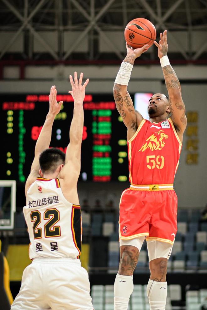 3月18日,浙江浙商證券隊球員雷瓊·塔克(右)在比賽中投籃。新華社記者 江漢 攝