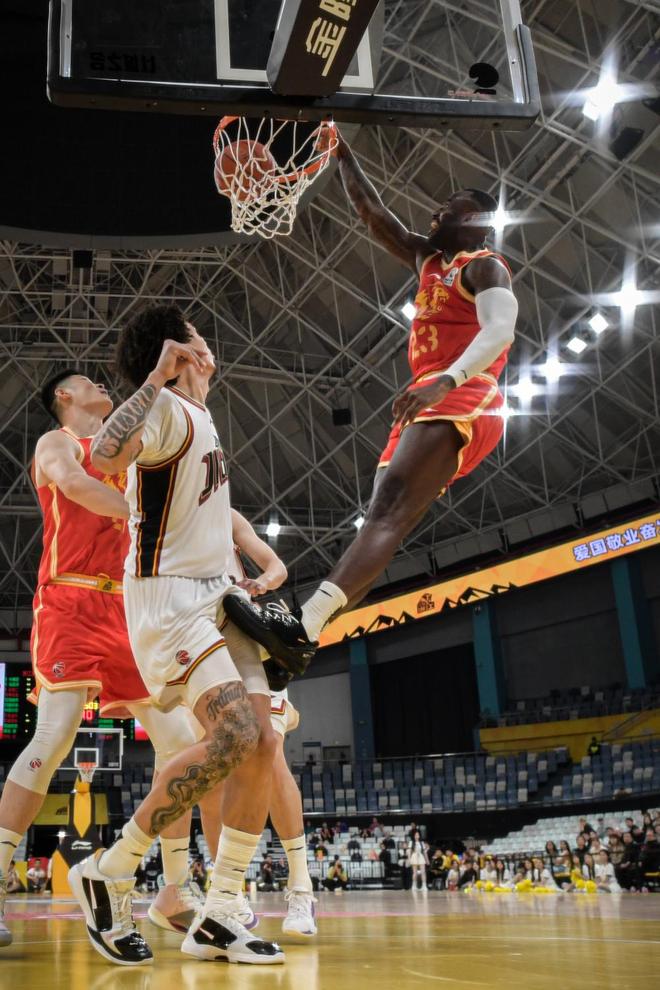 3月18日,浙江浙商證券隊球員賈卡爾·桑普森(右)在比賽中扣籃。新華社記者 江漢 攝
