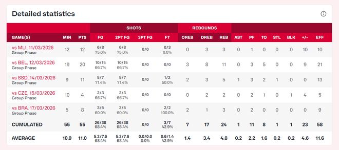 張子宇在最后兩場(chǎng)比賽中有意被宮魯鳴雪藏,對(duì)陣捷克只打10分鐘,對(duì)陣巴西只打5分鐘,因?yàn)樵谶@兩場(chǎng)比賽之前中國(guó)隊(duì)就已經(jīng)鎖定了一個(gè)出線的名額,宮魯鳴更多的想要實(shí)驗(yàn)陣容,但張子宇依舊神勇兩場(chǎng)比賽合計(jì)拿到12分5籃板。