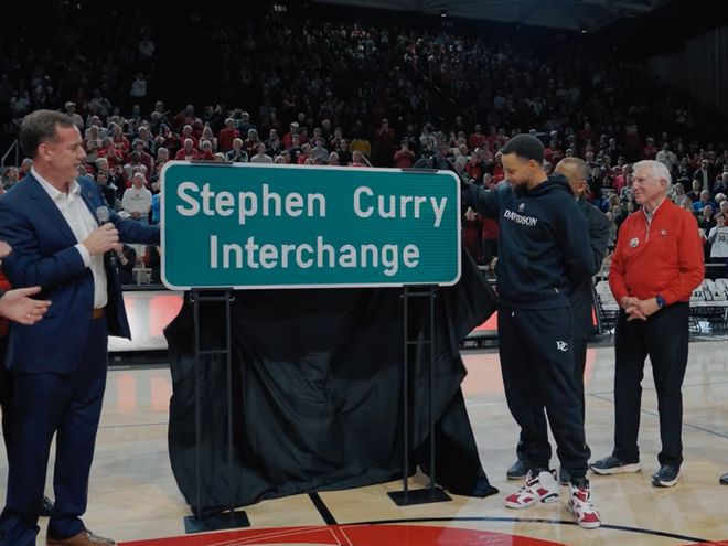 在這場大西洋十校聯(lián)盟的焦點(diǎn)對決中,37歲的庫里親自為新標(biāo)識牌揭幕。盡管很難判斷這份榮譽(yù)在他眾多成就中排名如何,但他明確表示自己覺得這太酷了。