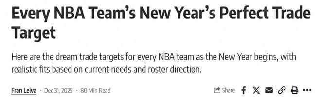 準備開搶!在賽季中期交易截止日臨近之際,美媒《FW》曬出NBA各隊最理想的交易目標,其中包括火箭5換1哈登,以及勇士隊6換1抄底字母哥。