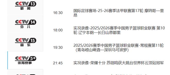 央視最新節(jié)目單顯示,央視體育頻道(CCTV5)、體育賽事頻道(CCTV5+)將現(xiàn)場直播2場。其中,CCTV5將從19:30開始,聚焦直播上海久事與衛(wèi)冕冠軍浙江廣廈方興渡的較量。