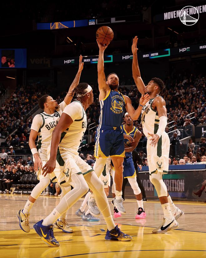 勇士隊的庫里上半場得到14分和4次助攻,梅爾頓得到11分,穆迪和普斯特各得到9分;雄鹿隊的字母哥得到18分和4個籃板,波特得到11分。