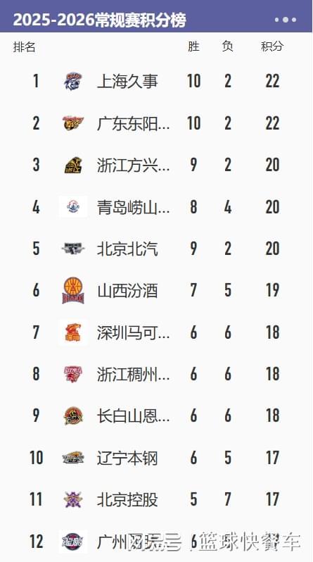 衛(wèi)冕冠軍廣廈隊(duì),他們的8連勝紀(jì)錄已經(jīng)被終結(jié)了,目前,廣廈的戰(zhàn)績(jī)是9勝2負(fù),依舊保持非常強(qiáng)的競(jìng)爭(zhēng)力。不過(guò),由于少賽一輪的緣故,他們?cè)谂琶仙晕⒊蕴潱瑫簳r(shí)只能屈居積分榜第三名。而排在積分榜第四名的是青島隊(duì),他們目前的戰(zhàn)績(jī)是8勝4負(fù)。作為本賽季第一爭(zhēng)冠熱門(mén)球隊(duì),北京隊(duì)則排在積分榜第5名,他們的戰(zhàn)績(jī)?yōu)?勝2負(fù)。不過(guò),和廣廈一樣,北京隊(duì)同樣少賽一場(chǎng),在排名上稍微吃虧。
