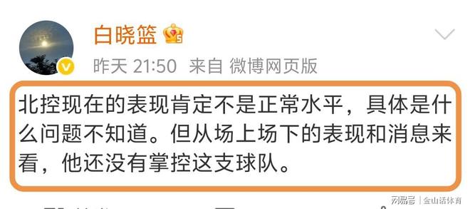 北控男籃士氣低落,也讓許多媒體人覺察到。賽后,媒體人白曉籃社媒發(fā)文點評本場比賽。配文:北控現(xiàn)在的表現(xiàn)肯定不是正常水平,具體是什么問題不知道。但從場上場下的表現(xiàn)和消息來看,他還沒有掌控這支球隊。
