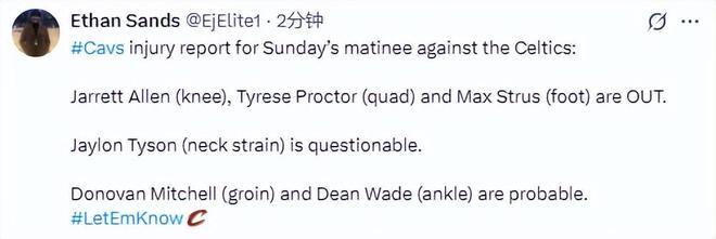 采訪結(jié)束后不久,騎士官方更新了明日對陣凱爾特人的傷病名單——