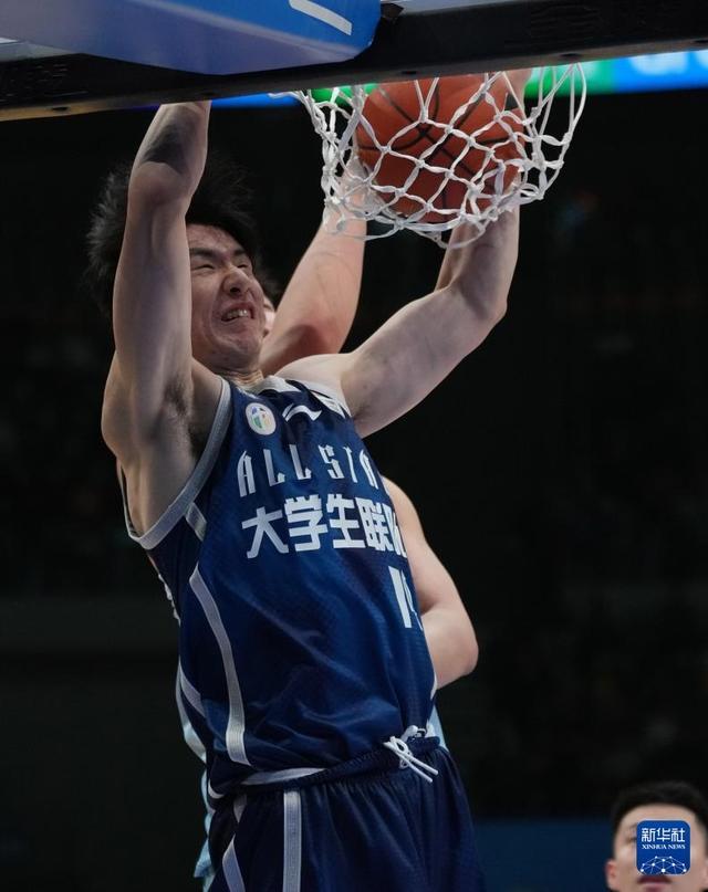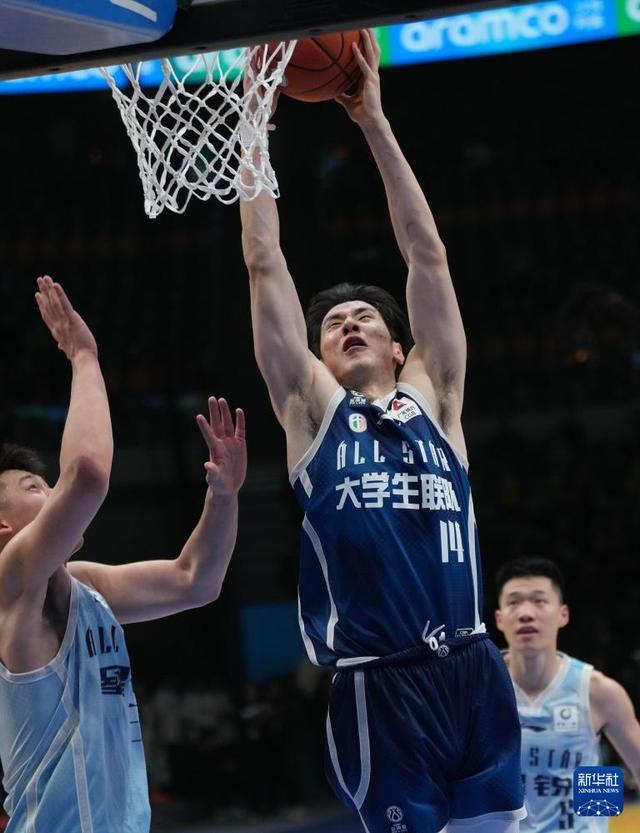 3月7日,大學(xué)生聯(lián)隊(duì)球員王浩霖(前)在比賽中扣籃。新華社記者 孟永民 攝