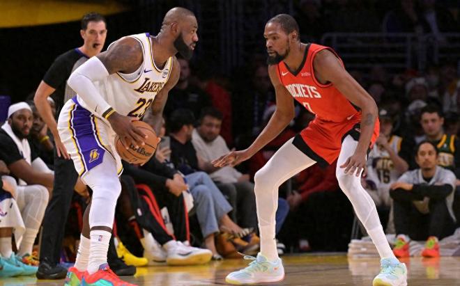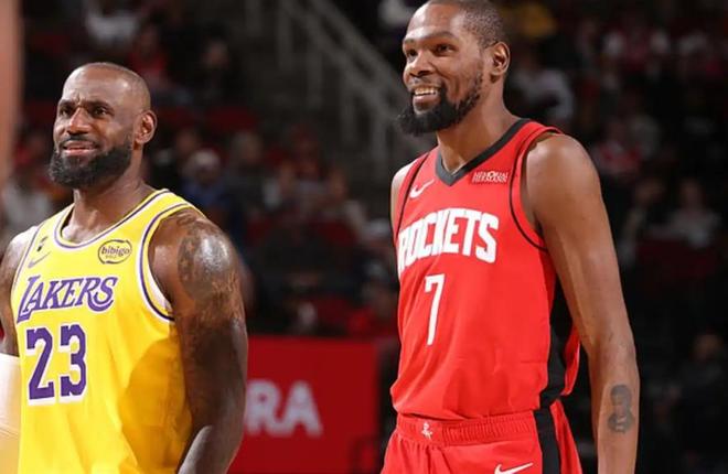 NBA常規(guī)賽,火箭坐鎮(zhèn)主場迎戰(zhàn)湖人。本場比賽的最大焦點,自然集中在詹姆斯和杜蘭特兩位超巨球員身上。