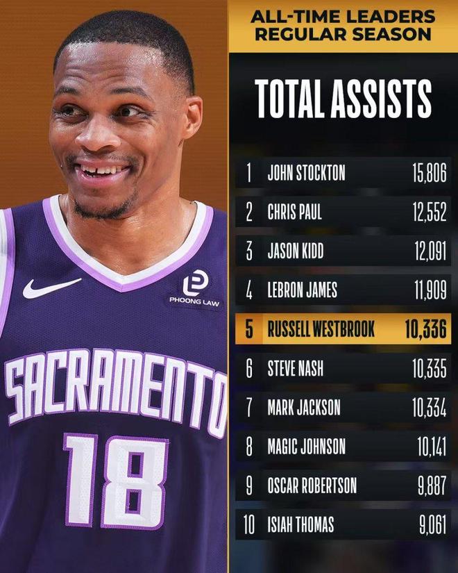 威少生涯常規(guī)賽總助攻數(shù),連續(xù)超越馬克-杰克遜與納什兩位退役名宿,升至NBA歷史助攻榜第5位。