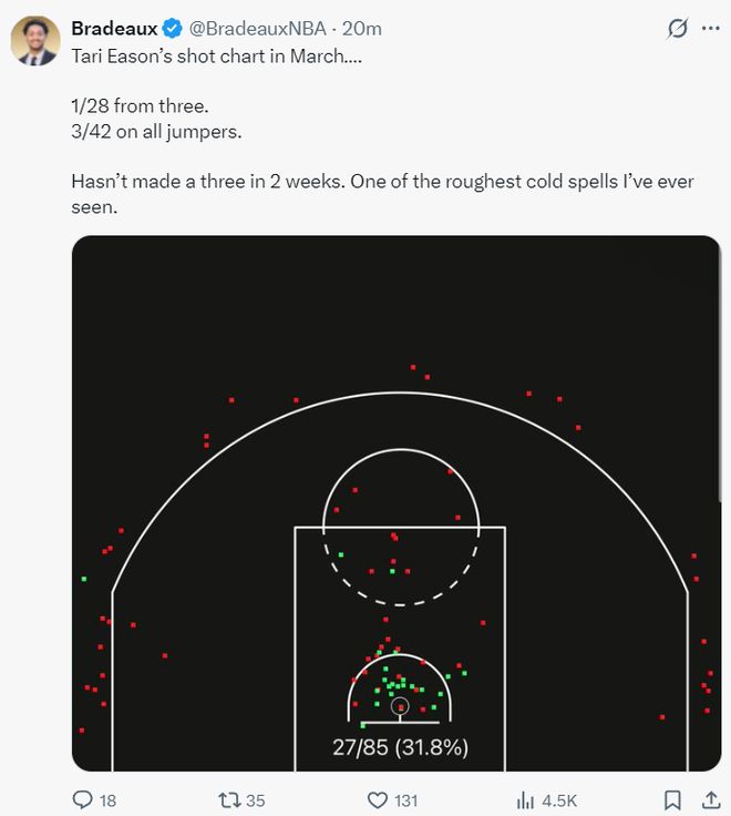 他曬出伊森三月份的投籃熱區(qū)(美國(guó)時(shí)間),三分球28中1(3.5%),跳投42中3(7.14%),伊森已經(jīng)超過兩周沒有投進(jìn)過三分,這是我見過最寒冷的投籃熱區(qū)圖。