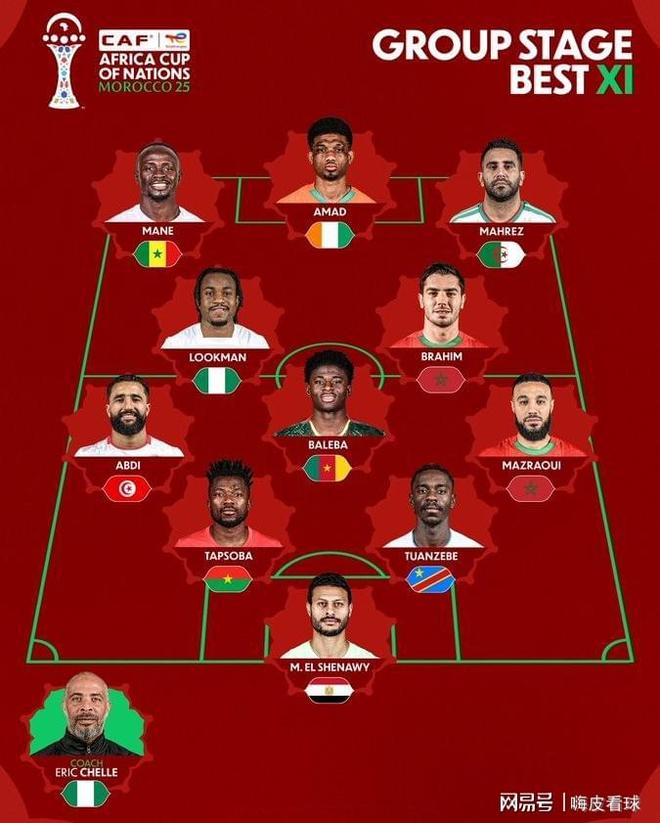 非洲杯官方公布,小組賽最佳11人出爐,門將是埃及的希納維,后衛(wèi)包括馬茲拉維、圖安澤貝、塔普索巴和阿卜迪,中場包括巴萊巴、盧克曼和迪亞斯,前鋒包括馬內(nèi)、迪亞洛和馬赫雷斯,主教練則是來自尼日利亞的謝勒。
