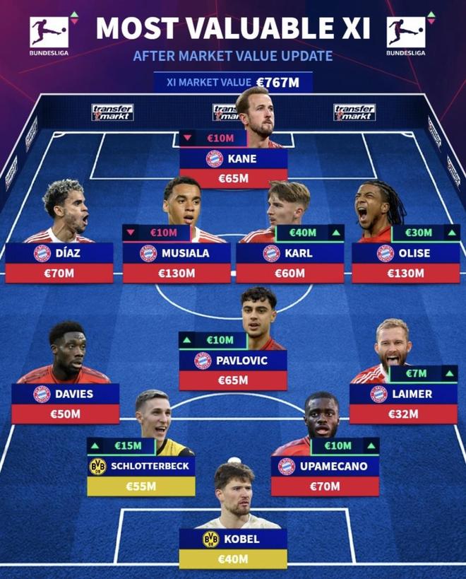 最近德國(guó)轉(zhuǎn)會(huì)市場(chǎng)發(fā)布了“德甲身價(jià)最高最佳陣容”,總身價(jià)7.67億歐元。凱恩、穆西亞拉、奧利塞、迪亞斯這些前場(chǎng)名字放在一起,紙面確實(shí)很豪華??申嚾輼?gòu)成也很刺眼:除了科貝爾和施洛特貝克,其他幾乎清一色來自拜仁慕尼黑,聯(lián)賽最佳陣容看起來更像拜仁的一套班底。這樣的集中度,德甲冠軍還有懸念嗎?