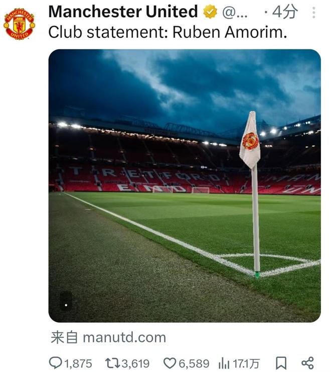 北京時間1月5日,曼聯(lián)在社交網(wǎng)站上發(fā)布聲明宣布,解雇現(xiàn)任主帥魯本·阿莫林。