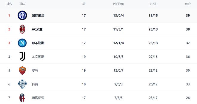 在積分榜上,國際米蘭以39分繼續(xù)領(lǐng)跑。AC米蘭緊隨其后,拿到38分。那不勒斯以37分排第3。尤文圖斯和羅馬都是36分,排名第4和第5名。爭冠格局白熱化,前5的球隊(duì)最多只差3分。不過,尤文圖斯和羅馬踢的場次比較多,比前3的球隊(duì)多踢了2場,他們要想沖擊冠軍還是比較困難??颇@匹黑馬在法布雷加斯的率領(lǐng)下戰(zhàn)績出色,總積分達(dá)到33分,排名第6。