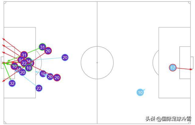 而這18次射門(mén)里,有10次攻門(mén)是中后場(chǎng)球員完成,其中禁區(qū)外遠(yuǎn)射達(dá)到7次,如圖所示。
