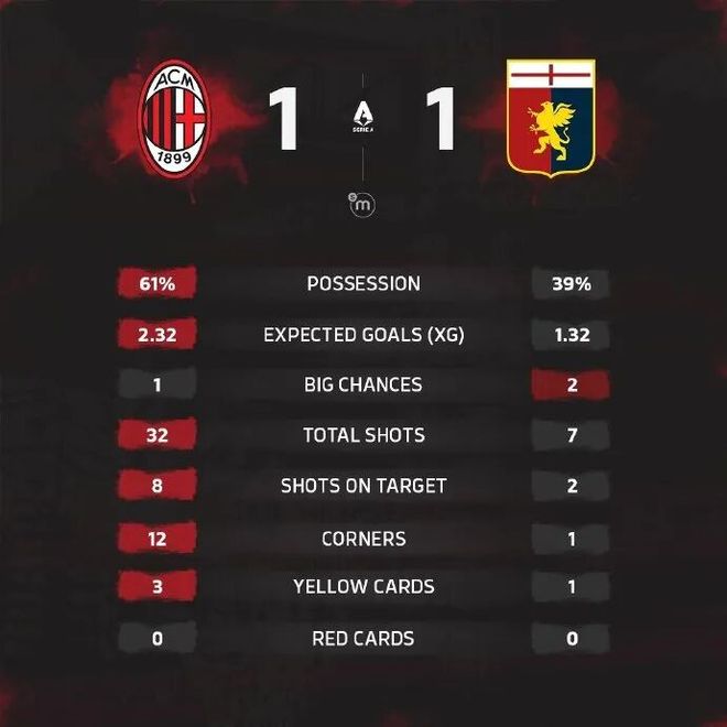 全場(chǎng)比賽結(jié)束,米蘭1-1熱那亞。