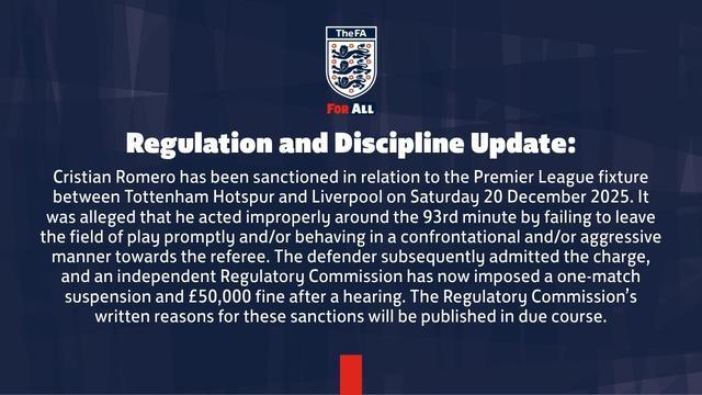 1月9日,英足總官方發(fā)布對(duì)托特納姆熱刺后衛(wèi)羅梅羅的處罰決定,羅梅羅將遭追加停賽1場(chǎng)并被罰款5萬(wàn)鎊,無(wú)緣足總杯對(duì)維拉比賽。本次處罰的事由是針對(duì)他在12月對(duì)陣?yán)锲值挠⒊荣愔腥炯t后賽后針對(duì)裁判的不當(dāng)行為。