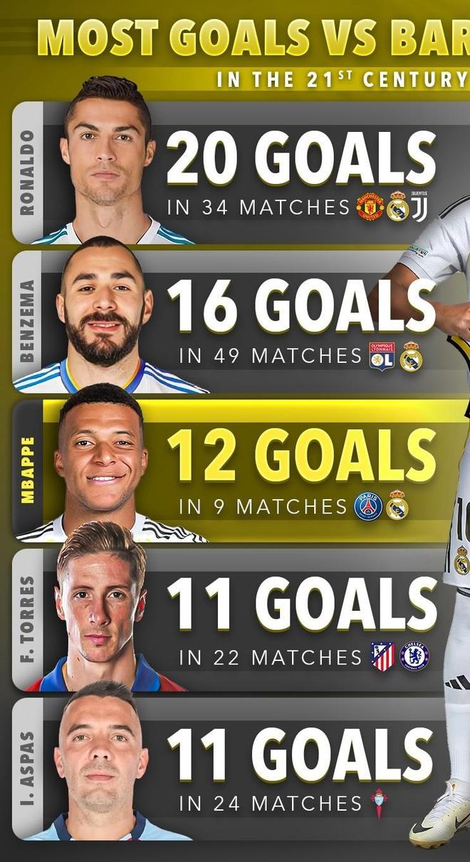 近日,Score90統(tǒng)計(jì)了21世紀(jì)對(duì)陣巴塞羅那進(jìn)球最多的球員榜單。C羅以20球(34場(chǎng))居首,本澤馬以16球(49場(chǎng))位列第二。姆巴佩雖僅交手9場(chǎng),但已攻入12球。